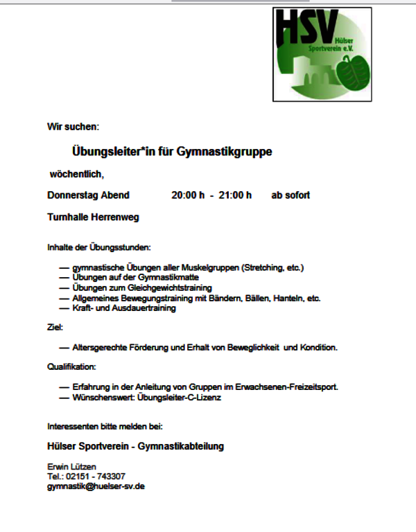 Die Gymnastikgruppe Donnerstag Abend 20:00 Uhr sucht einen Übungsleiter*in!!