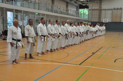 Eingeladen waren alle Karatekas des Shotokan-Ryu, aber auch aus anderen Karatestilen. Über 50 Teilnehmer-innen aus Belgien, den Niederlanden und verschieden Dojos rund um Krefeld ließen es sich nicht entgehen, beim Meister Silvio Campari, Meisterschüler und Schwiegersohn des japanischen Großmeisters Hiroshi Shirai 10.Dan, am Unterricht teilzunehmen. Geübt und vermittelt wurden Grundschultechniken, die in verschiedenen Formen, genannt KATAS, ihre Anwendung fanden. Sensei Silvio Campari legte großen Wert auf korrekte Ausführungen und präzise Techniken. Natürlich unterrichtete er auch die KATA Hangetsu, deren Halbmondstände und Bewegungen typisch sind.