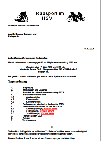 Abteilungsversammlung Radsport am 17.03.2026 17:00 Uhr im CTC KR