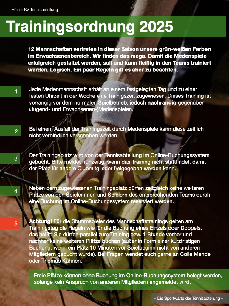 Von nix kommt nix. Deshalb hauen die Spielerinnen und Spieler unserer Mannschaften in den nächsten Wochen und Monaten mächtig rein und auf den Ball – damit sie in der Medensaison auch in Form sind. Damit das alles reibungslos abläuft – vor allem in Bezug auf die Platzbuchung mit unserem Online-Buchungssystem – gibts ein paar Regeln, die ihr beachten solltet: