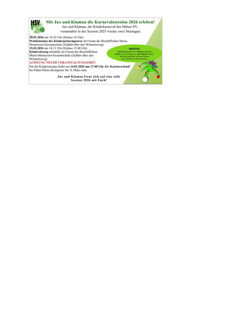 Jux und Klamau, das ist der Kinderkarneval im Hülser Sportverein – deswegen ist ein wichtiges Kriterium bei der Auswahl der Regenten mit Ihren zwei Pagen und dem Standartenträger, dass diese im Hülser SV aktiv sind.