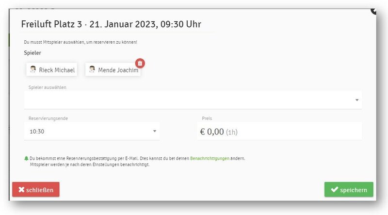 Wenn ihr auf „Reservierung“ drückt, kommt ihr zum Reservierungs-Fenster und könnt buchen. Sucht euch Platz und Uhrzeit aus, an der die Buchung beginnen soll. Wenn ihr auf das entsprechende Feld drückt, öffnet sich das Buchungsfenster. Jetzt müsst ihr nur noch den bzw. die Spielpartner(in) und das Ende der Reservierung eintragen. Speichern. Fertig!