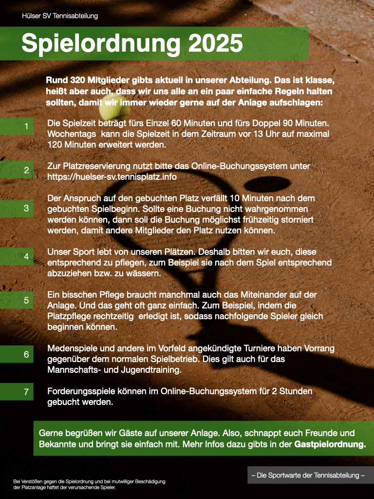 Vereinsmitglieder können einen Platz buchen. Gäste können weiterhin die Anlage nutzen, jedoch muss die Buchung von dem Spielpartner (Vereinsmitglied) vorgenommen werden.