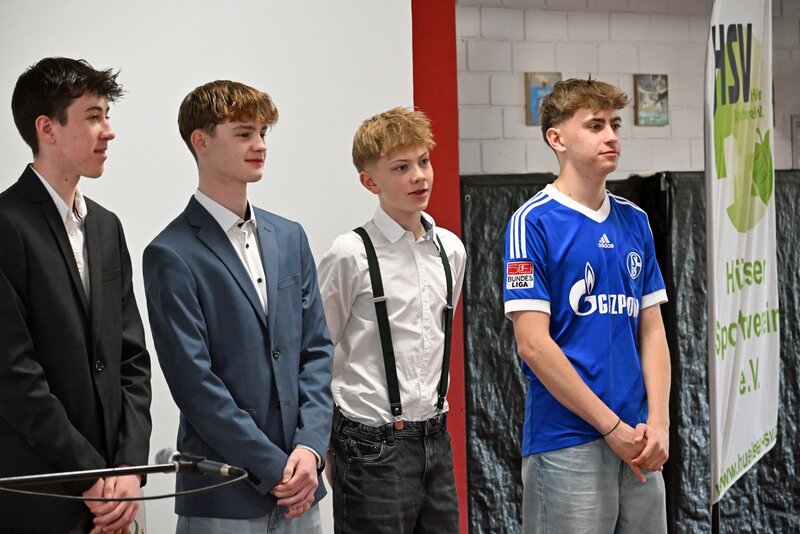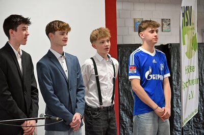 Zum Abschluss einer rundum gelungenen Veranstaltung dann noch der Auftritt von Lasse Boymanns, Felix Erlenwein, Matti Fenkes und Linus Walkenbach, die in Anlehnung an die Tagesschau die neuesten Juxi-News aus Hüls präsentierten. Da wurden wieder bekannte Hülser „Größen“, die Schlaglochsituation und ein Interview mit einem musikalischen Hülser Original humorvoll den begeisterten HSV-Senioren näher gebracht. Viel Beifall und zum Dank Eisgutscheine gab es für den tollen Auftritt der Akteure.