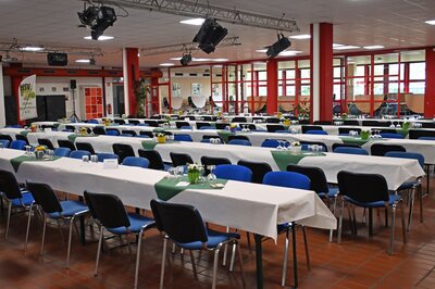 Wie im Vorjahr hatten sich wieder rund 150 Teilnehmer zum traditionellen Hülser SV-Senioren-Frühschoppen angemeldet und wurden sehr herzlich vom Ältestenratvorsitzenden Harald Stemmle im festlich geschmückten Foyer der Robert-Jungk-Gesamtschule begrüßt. Neben Harald Stemmle standen an diesem Morgen Alexander Keyserlingk, 2 Tage zuvor zum 1. Vorsitzenden und Verena Schön am gleichen Tag auf der Hülser SV-Mitgliederversammlung zur stellvertrenden Hülser SV-Vorsitzenden gewählt. Beide stellten sich den anwesenden Hülser SV-Senioren kurz vor und wurden mit herzlichem Beifall bedacht.