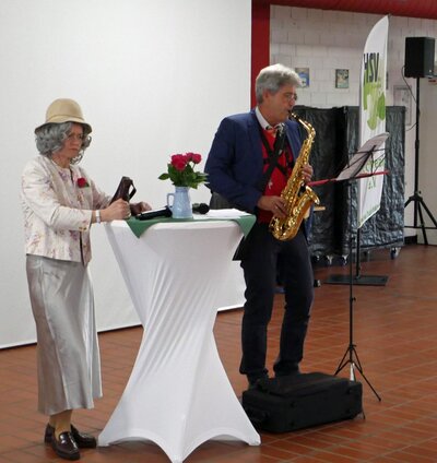 Es folgte der starke Auftritt von Frau Tietze + Herr Blömle und die Anwesenden wurden Zeuge eines umständlichen Kennenlernens in einem Gartenbauverein, einem „Blind-Date“, das unter dem Kennwort „Rote Rose“ und der Verwechslung der Datepartner zu einem „Aneinandervorbeireden-Sketch“ urkomisch von Katrin Evertz und Ralph-Harry Klaer gespielt und mit starkem Beifall bedacht wurde.